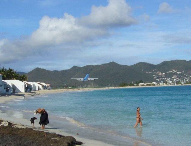Nur "speziell" ausgebildete Piloten dürfen den Jumbo hier auf Sint Maarten starten! Die Landebahn ist extrem kurz und der Flieger muss vor dem Bergmassiv hoch gedrückt werden!