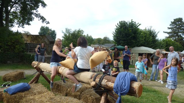 Hier haben zwei Mädels Riesenspaß mit einer Kissenschlacht auf einem Holzbalken